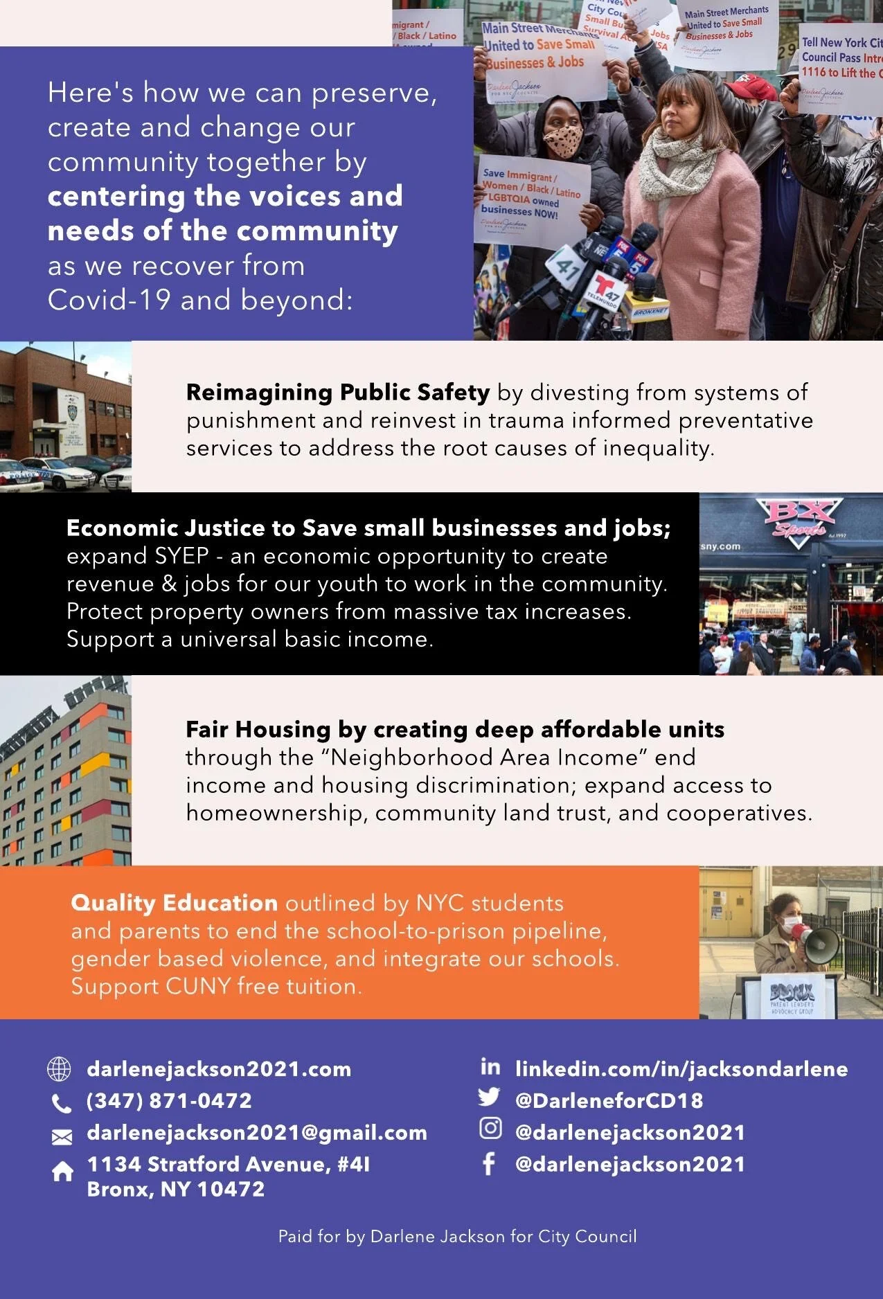 Together, the community can decide how to preserve, create and change council district 18. Darlene Jackson wants to Redefine Local Government by centering the voices and needs of the community, while recovering from Covid-19 and beyond.